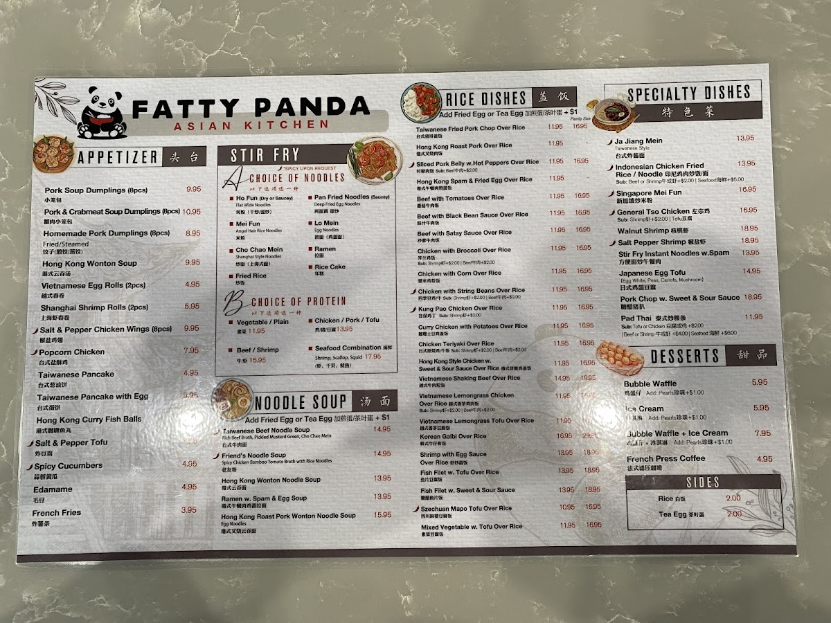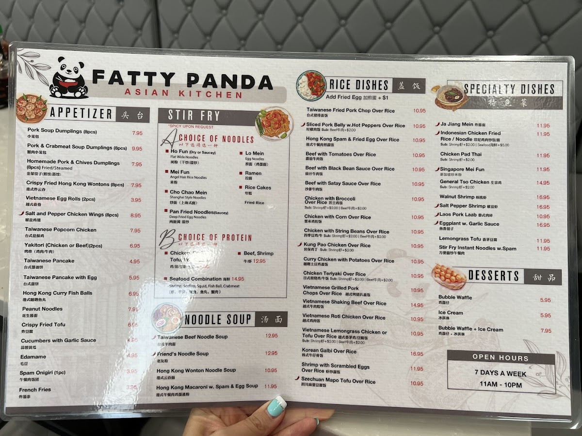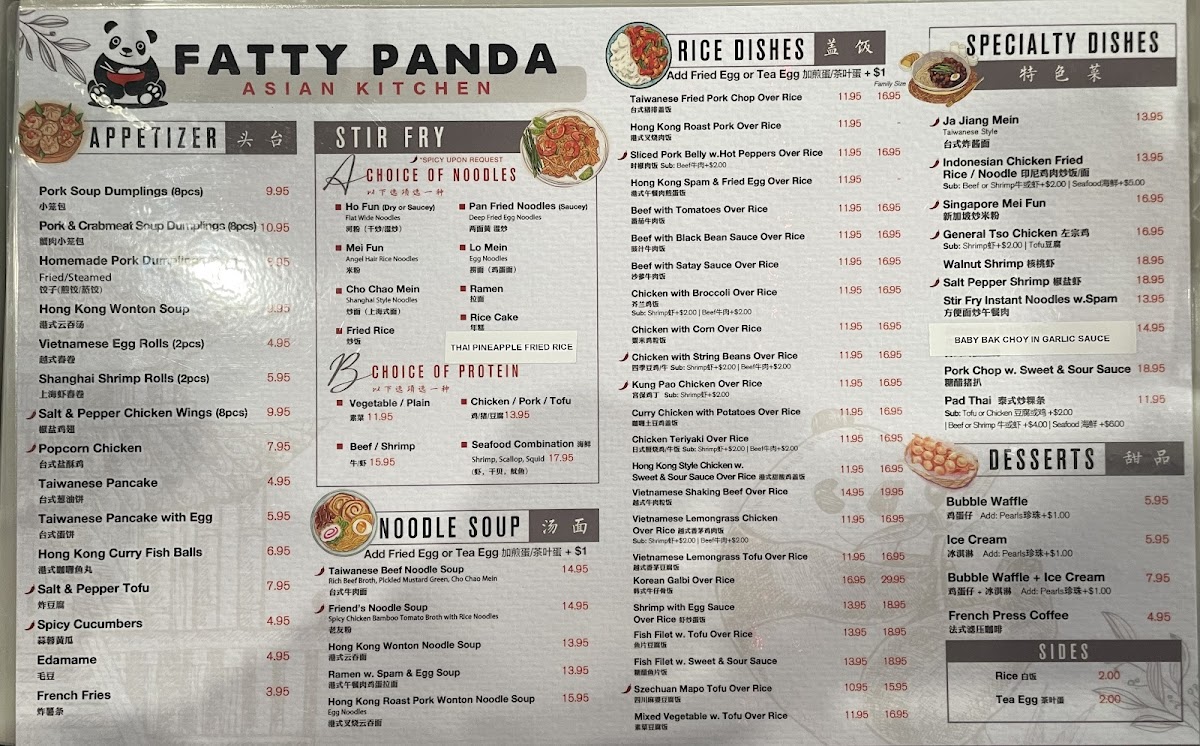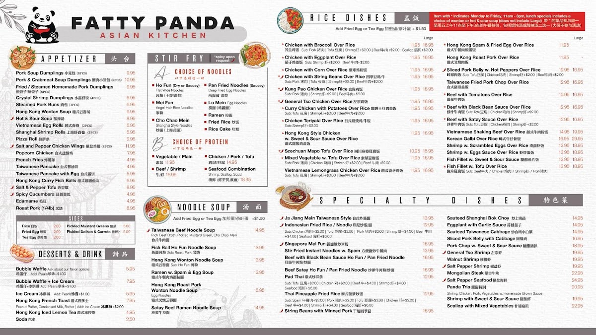 Pork with Broccoli over Rice 芥兰猪肉饭: Tender pork and fresh broccoli served on steamed rice. Soup options: Hot & Sour Soup 酸辣湯, Wonton Soup 港式云吞汤.
