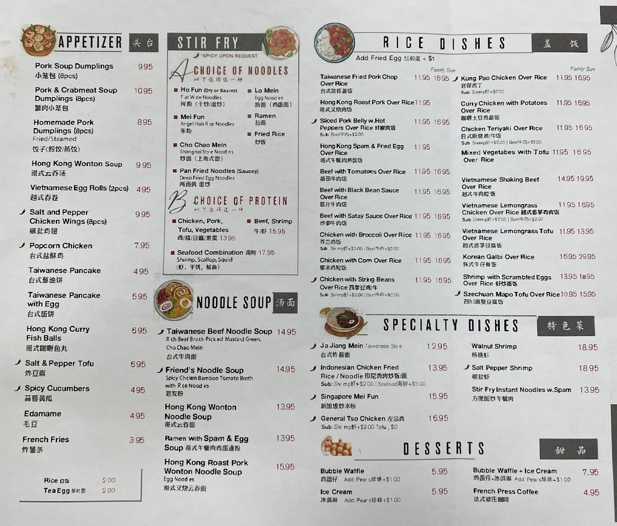 Curry potatoes over rice 咖喱饭 – Choice of chicken, tofu, beef, or shrimp. Served with Hot & Sour Soup 酸辣湯 or Wonton Soup 港式云吞汤.